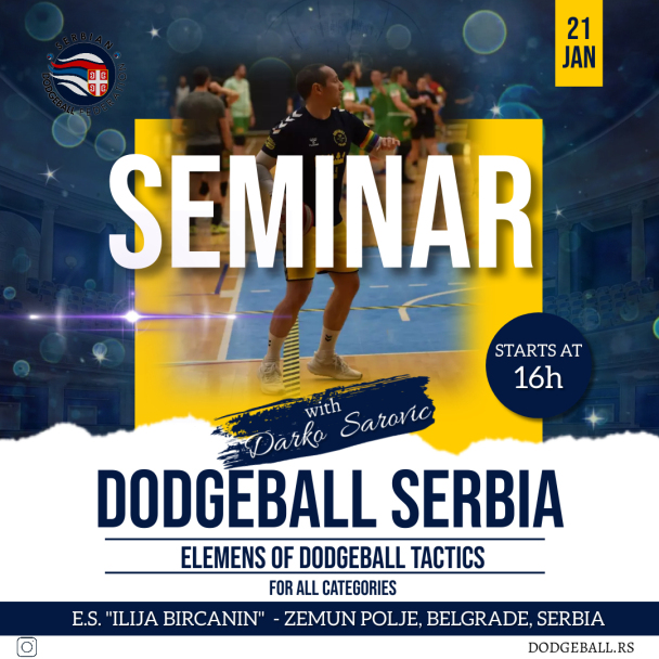 U Zemunu će 21. januara 2024. godine u 16h u sali OŠ"Ilija Birčanin" biti održan Seminar dodžbola na temu "Osnove taktike dodžbola - platenena lopta" koji će voditi kapiten Švedske reprezentacije Darko Šarović. Čast nam je i zadovoljstvo ugostiti jednog od najboljih svetskih igrača i vrsnog fakultetskog predavača, kao i pozvati sve zainteresovane sadašnje i buduće dodžbolere da nam se pridruže. Vidimo se!